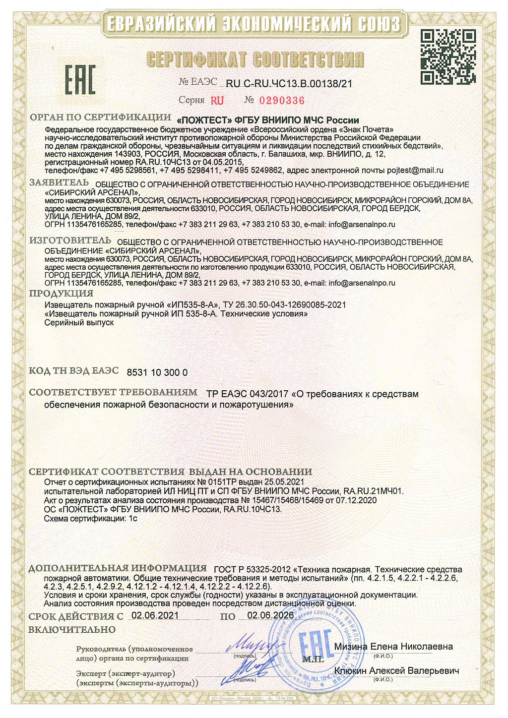 Извещатель ИП 535-8-А Сибирский арсенал купить в Перми в компании ВИПАКС.