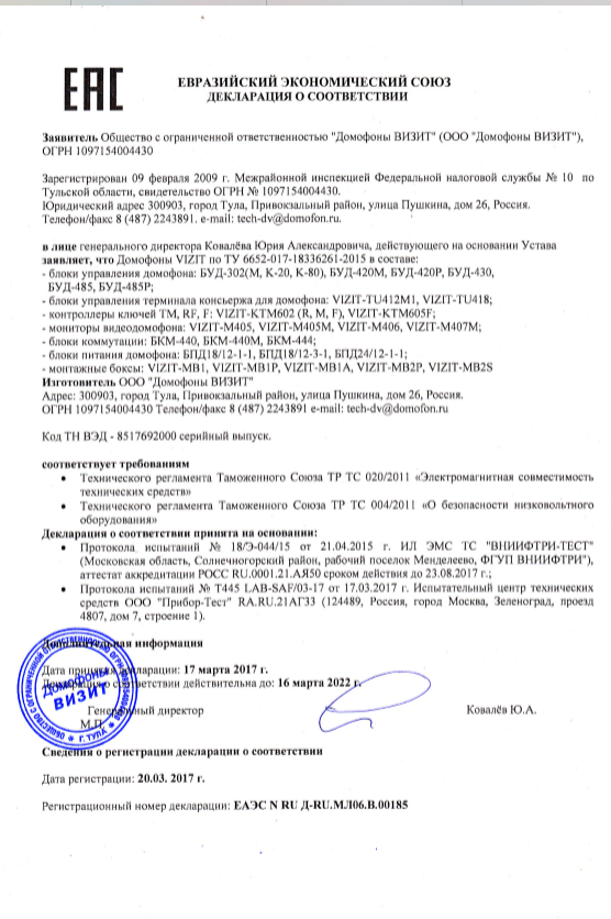Контроллер ключей VIZIT-КТМ602M, емкость которого составляет до 670 ключей, осуществляет питание и управление открытием замка. Контроллер для домофона имеет таймер (1 или 5 сек). Напряжение питания контроллера составляет 190-240VAC.